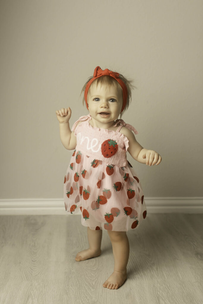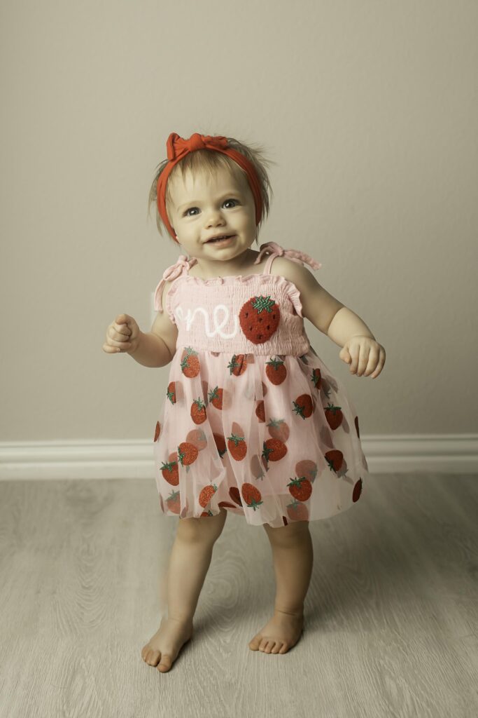 She brought her signature personality to the session—exploring, sampling a strawberry or two, and giving us those sweet, happy expressions that make milestone sessions so memorable. Even a few minutes in the studio was enough to capture her charm, her sparkle, and her unmistakable cuteness.