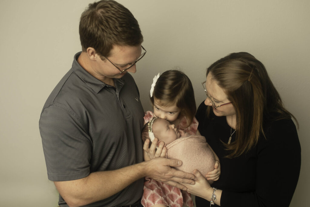 Big sister was thrilled to meet her new sibling, and her excitement and affection made the day even more special. Watching her shower her little sister with kisses and hugs created some of the most heartwarming moments of the session. Including older siblings in newborn photography is always such a joy—it captures the bond that begins right from the very first days of life and adds depth and emotion to your family’s story.