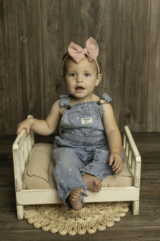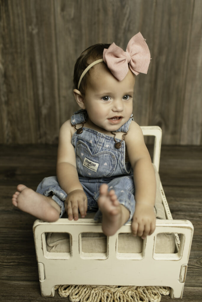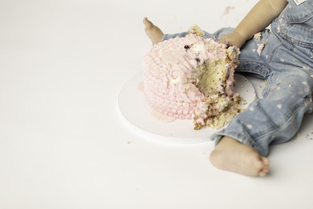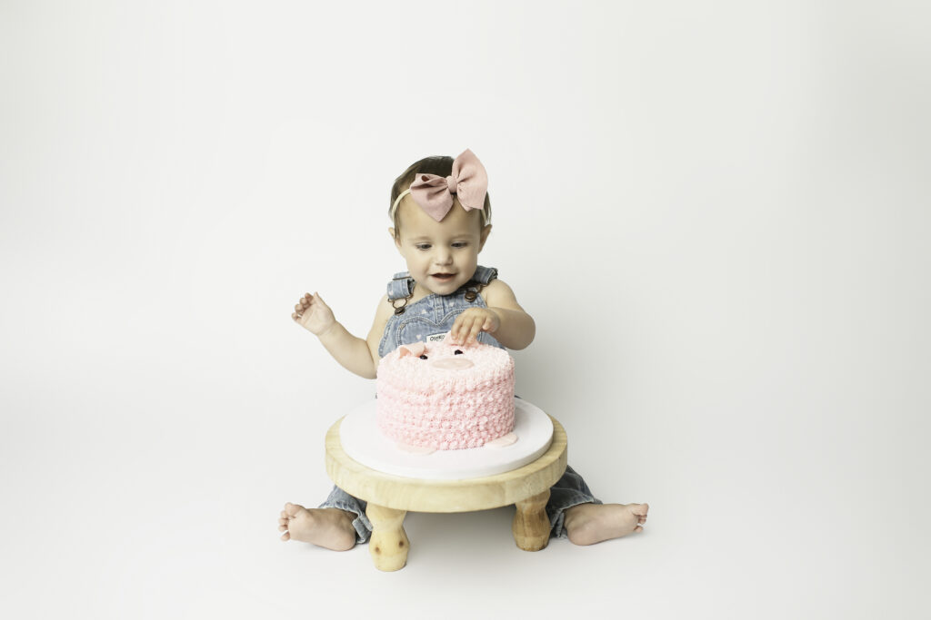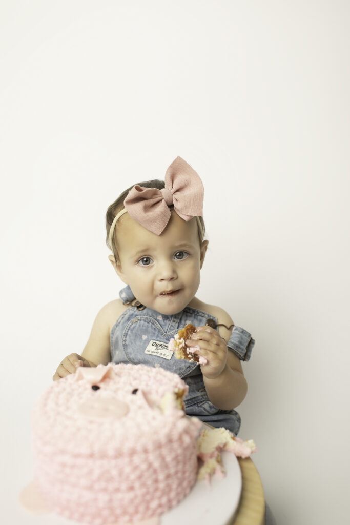 After the fancy portraits, it was time to get a little messy and playful with a cake smash! Swapping the dress for overalls was the perfect transition for this fun, hands-on part of the session. The cake smash is always a favorite — it’s the moment where little personalities shine, creativity and curiosity take over, and laughter fills the studio. Watching baby dive into the cake and enjoy every bite made for some of the cutest, most candid photos of the day.