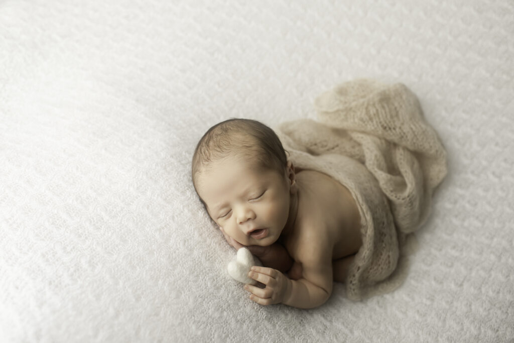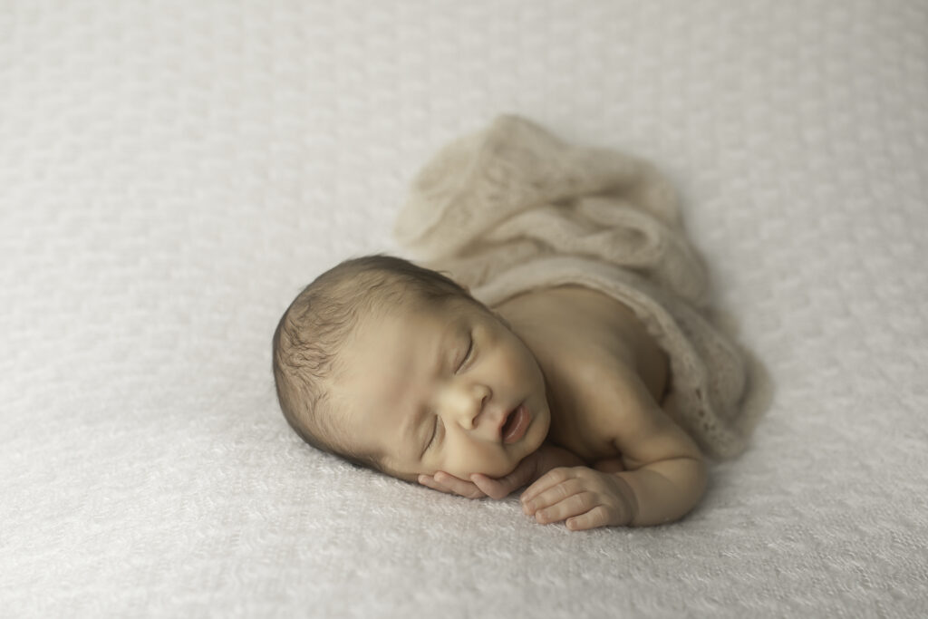 Once he had a few moments to adjust, he dozed off into dreamland. The studio’s warm, peaceful atmosphere and soft wraps created the perfect environment for rest, snuggles, and gentle posing.