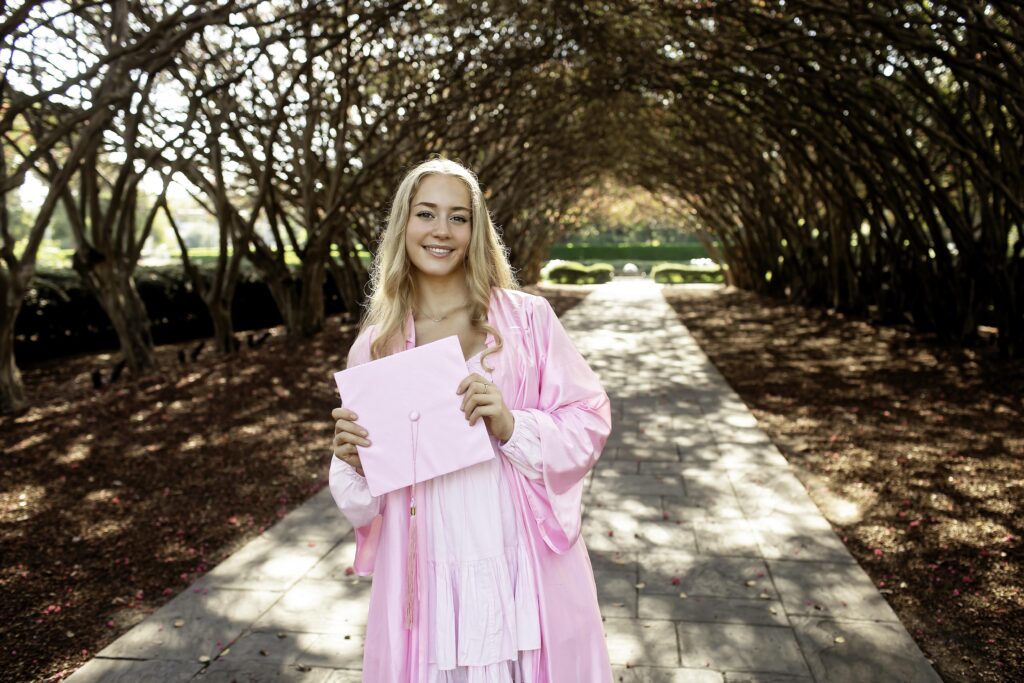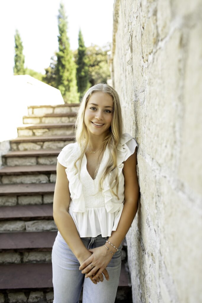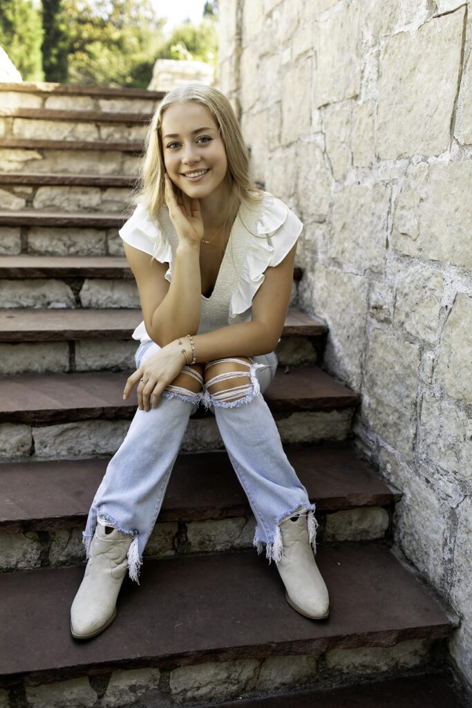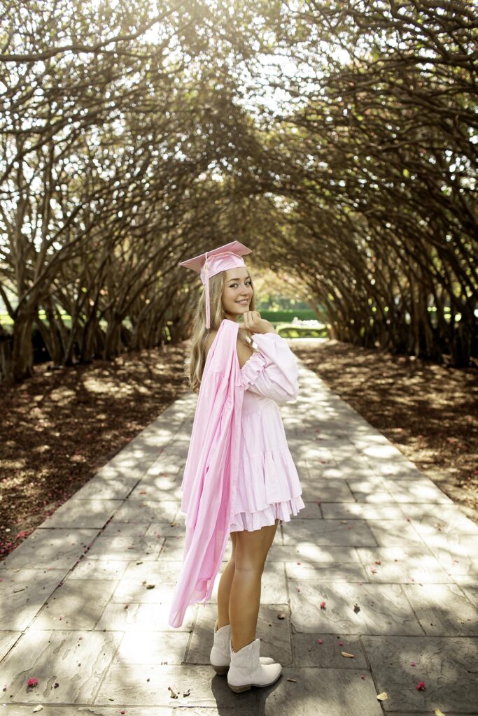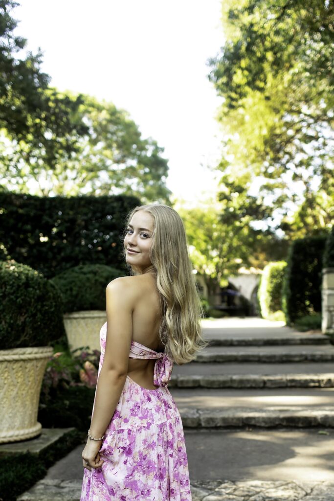 The Dallas Arboretum is one of my favorite spots for senior sessions. With its stunning gardens, winding paths, and colorful backdrops, there’s endless beauty to explore — and we made sure to find some of the best spots! We started on a charming bridge, where the soft light and surrounding greenery created the perfect scene for classic portraits. Then we discovered a cool tree tunnel that added a fun, whimsical vibe — just right for showing off her personality and spirit. And of course, we couldn’t resist using the stairs! The mix of architecture and nature made for beautiful, dynamic images that felt full of energy and life.