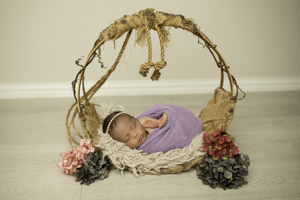 After capturing those classic newborn poses, we transitioned to something a little more creative—two different hanging basket setups! These prop scenes are always a hit, adding a touch of whimsy and elegance to the session. She looked absolutely precious nestled in each one, perfectly peaceful and oh-so-tiny. The textures, colors, and lighting came together to make each image feel timeless.