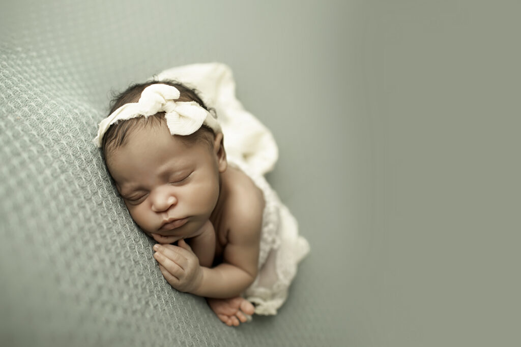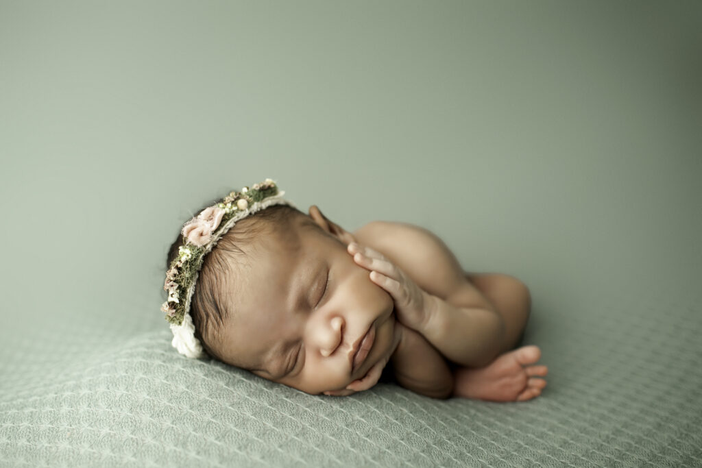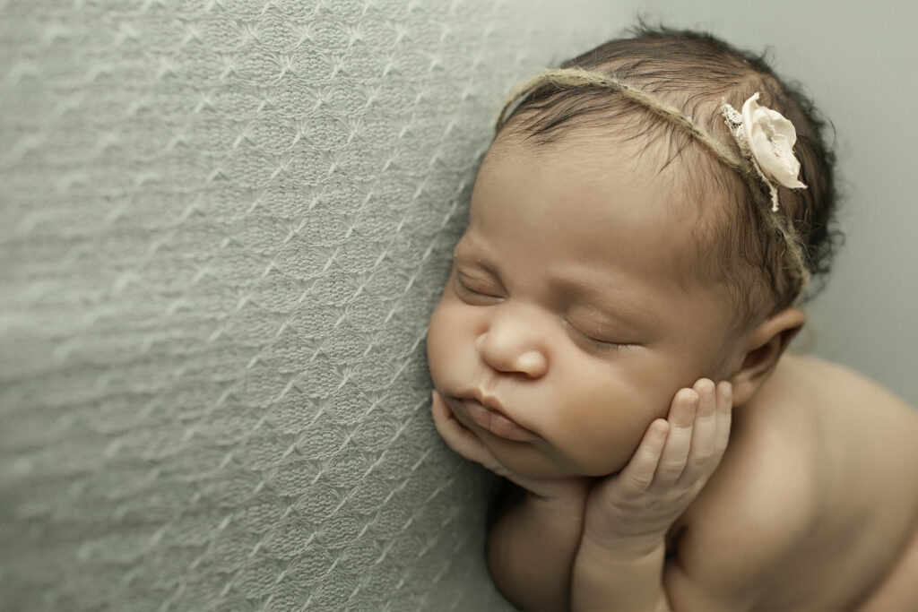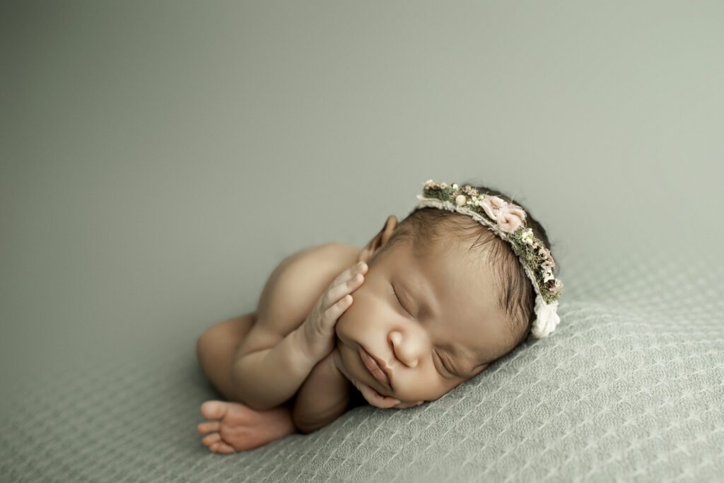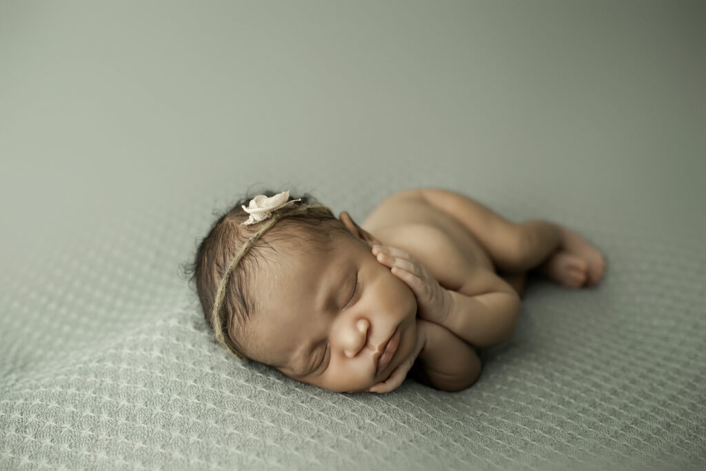 From the moment she arrived, this baby girl was calm, content, and ready to model. We started with our most-requested setup—the teal blanket, a studio favorite among our clients. The soft color beautifully complemented her skin tone and made her delicate features stand out even more. Every pose on that cozy blanket was dreamy and serene.